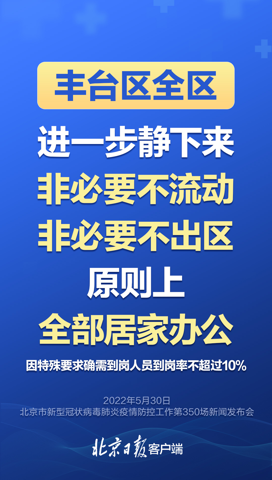 5月30日,在北京市新型冠状病毒肺炎疫情防控工作第350场新闻发布会上,丰台区委常委、宣传部部长韩新星介绍,该区推动全区进一步“静下来”,从严做好社会面防控。按照“非必要不流动”“非必要不出区”的要求,除从事城市运行保障、公共服务和疫情防控的一线人员外,原则上全部居家办公。因特殊要求确需到岗人员,到岗率不超过10%。全区按社区、小区实行网格化管理。所有涉疫风险人员严格按管控措施落点、落位、落责、落实。