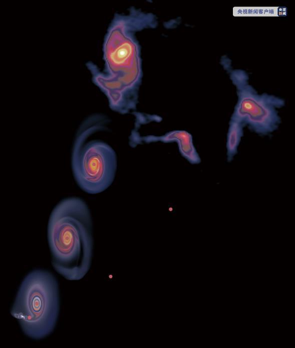 更加出乎意料的是,这个吸积盘有一对明显的旋臂结构。这种旋臂结构在星系盘中常见,但在原恒星盘中较为罕见。一般认为这种旋臂结构是吸积盘自身引力不稳定,从而碎裂导致的。但是本次研究发现,这个大质量早型O型星的吸积盘中气体温度较高、湍流较强,足以维持吸积盘自身的稳定性。因此,研究人员认为存在另一个可能的解释,即旋臂是受到外部扰动产生的。在这个吸积盘周围几千天文单位远的地方,研究人员恰好发现了一个3倍太阳质量的天体,可能就是外部扰动的来源。为了验证这一猜想,他们首先利用解析计算,检查了这个天体几十种可能的历史轨迹,发现只有在一种轨迹下,它才可以扰动吸积盘。然后研究人员在上海天文台的高性能超级计算机平台上,利用数值模拟追踪了这一轨迹,重现了这个天体在一万多年前掠过吸积盘、并在吸积盘中搅出旋臂结构的完整过程。解析计算和数值模拟结果均与观测结果完全对应,因此,这个吸积盘中的旋臂很可能是周围天体造访过程留下的遗迹。