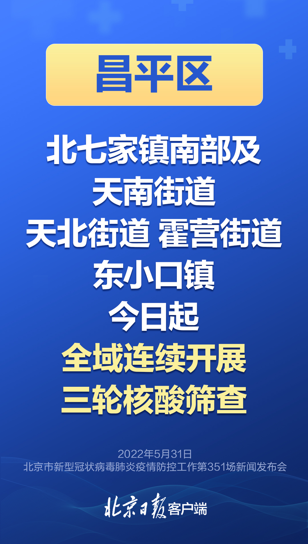 今天(5月31日)下午,北京召开第351场疫情防控新闻发布会。会上,昌平区委常委、常务副区长杨仁全通报:昌平区进一步强化重点区域核酸筛查。昨日已完成东三旗村10887人核酸检测,结果均为阴性。今日起对北七家镇南部及天南街道、天北街道、霍营街道、东小口镇全域连续开展三轮核酸检测筛查。