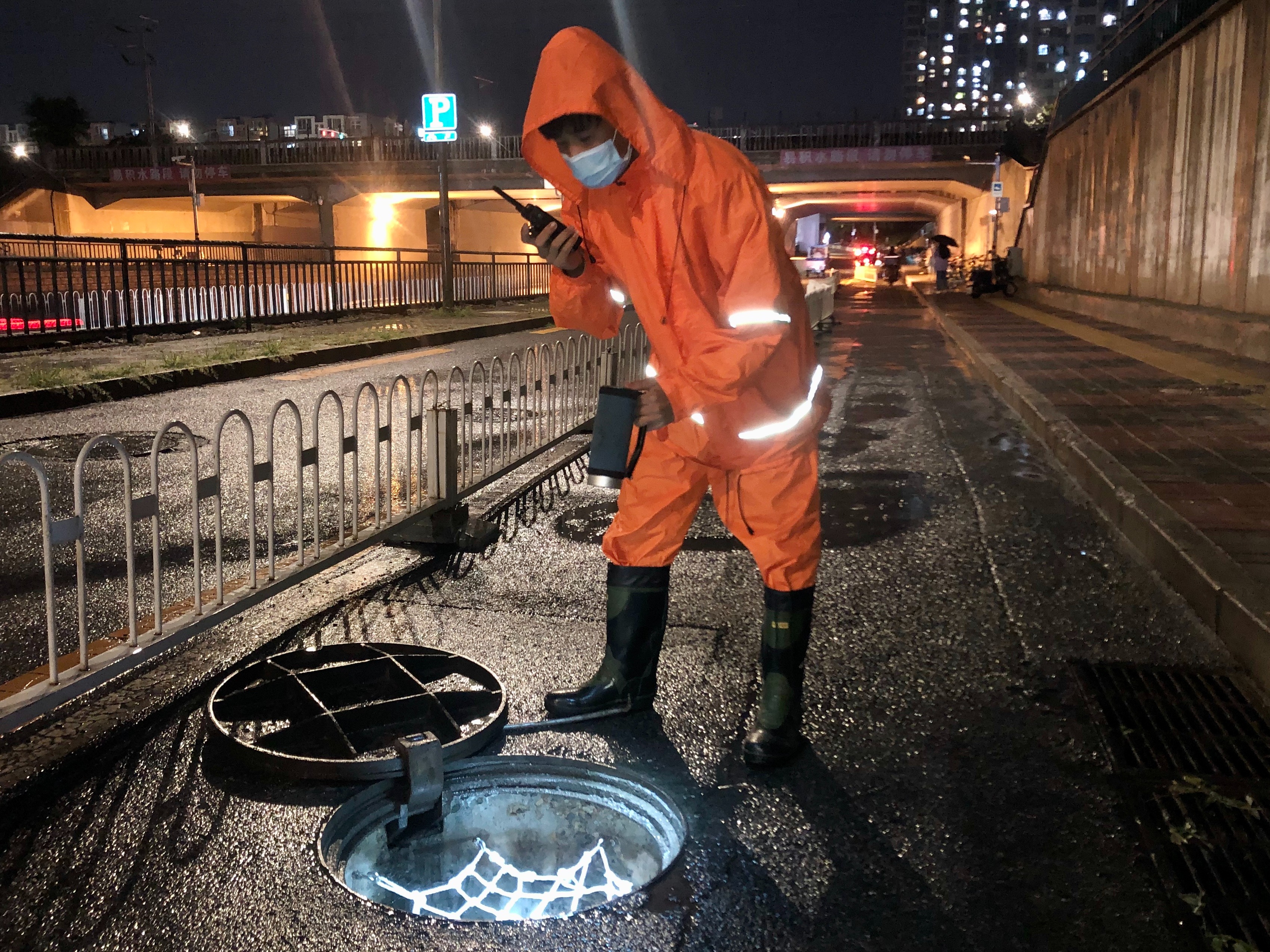 夜晚,北京排水集团工作人员检查防汛设施