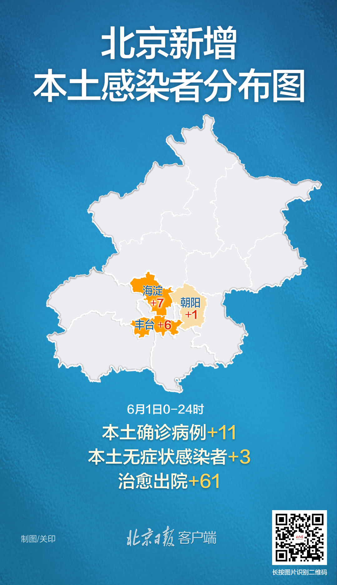 6月1日0时至24时,北京新增11例本土确诊病例和3例无症状感染者,无新增疑似病例;无新增境外输入确诊病例、疑似病例和无症状感染者。治愈出院61例。