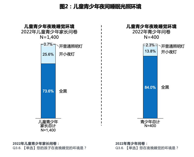 调研数据显示,73.6%的儿童青少年家长反馈自己的孩子夜间睡眠环境为全黑,然而这一数字在儿童青少年调研数据中为84.0%。这可能说明家长和儿童青少年对全黑的睡眠环境的认知存在差异。因此保证严格的全黑睡眠环境对于儿童青少年的近视防控至关重要,家长在保证孩子充足睡眠时间的同时,也要意识到全黑睡眠光照环境对孩子眼健康的重要影响。