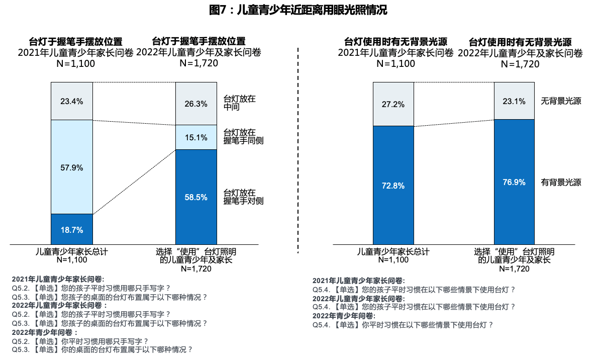 2022年调研数据显示,58.5%的儿童青少年在近距离用眼时会将台灯摆放在握笔手的对侧,较2021年调研结果18.7%,有大幅增长;76.9%的儿童青少年会在台灯使用时同时打开卧室照明灯等背景光源,较2021年调研结果72.8%,稍有增长。