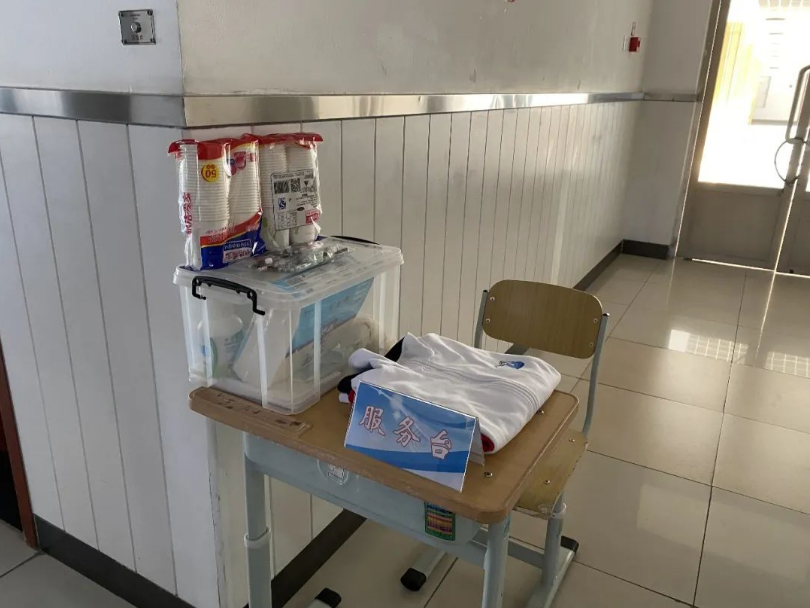在考点每层楼内,学校都设置了专门的“服务台”,每个服务台上都摆放着备用衣物、备用文具、一次性纸杯、口罩等物品。每个考场内也摆放着供考生使用的应急物品。