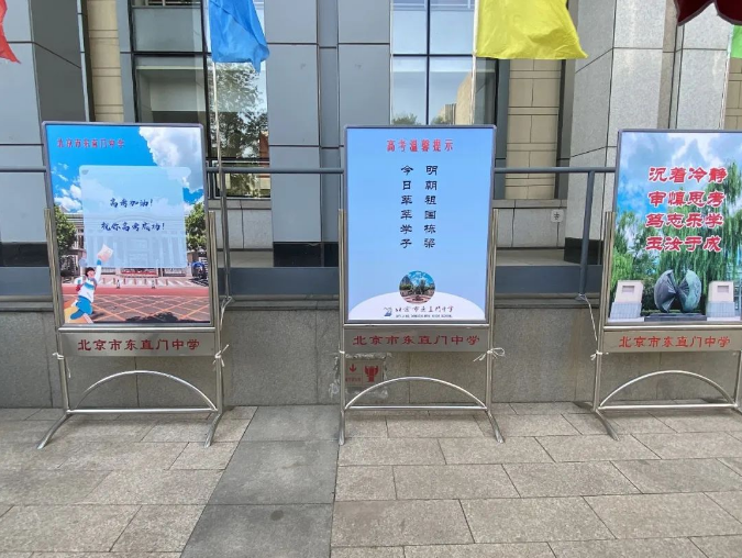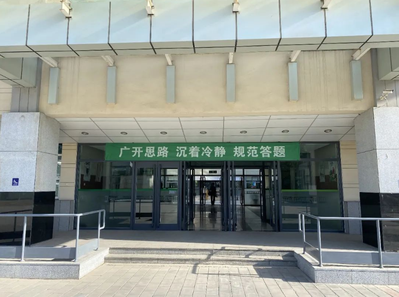 学校在考点门口至进入考场楼之间贴心设置了遮雨遮阳棚,确保考生在进入考场的过程中,不受极端天气的影响。在入场通道外,随处可见高考温馨提示标语牌。