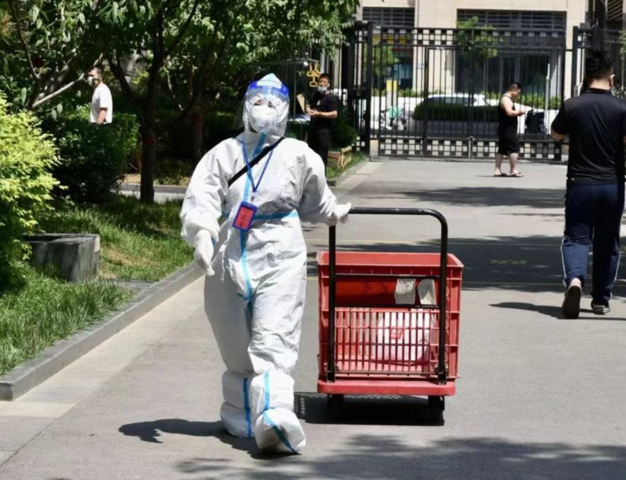 不仅是在核酸现场,在物资搬运现场也总能看到她忙碌的身影,送菜、送药、送快递,保证居民吃上菜,及时吃上药,每一栋、每一层、每一家快速及时有序的分发,敲门告知居民门口自提,充分做到非接触式配送,减少了相互交叉感染的风险,能力范围内解决居民们的需求。