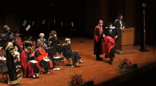 综合达尔豪斯大学的毕业典礼直播视频和这名留学生发布在个人社媒上的相关信息,他的英文名为“JUNYI HE”,当天获得政治学和经济学双学位。