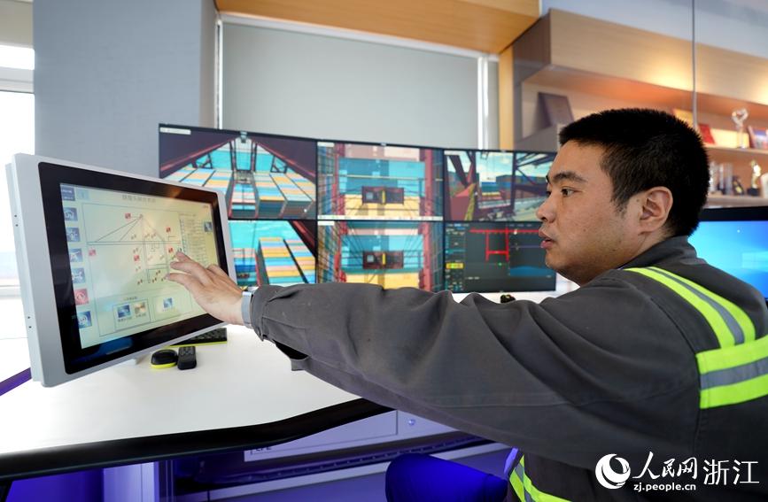 竺士杰已成为桥吊班大班长,管理着300余名桥吊司机。人民网 郭扬摄