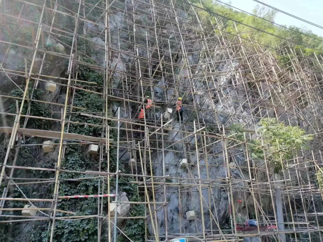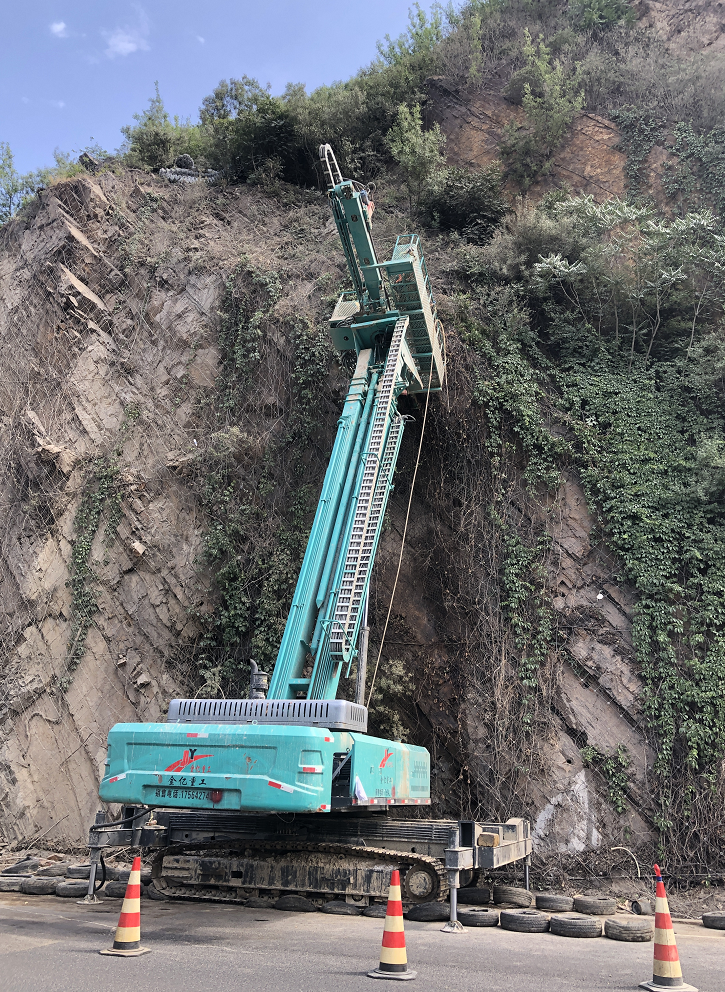 京青线路旁,一群系着安全绳索的“蜘蛛人”正上下游走加装防护网和锚杆,将裸露的山体牢牢“包裹封装”。不同于往年搭建脚手架使用手持电动钻机,今年施工队伍加入“新成员”高臂钻机,节省人力、打孔快速、安全性高、方便灵活,大幅度提升安装作业效率。