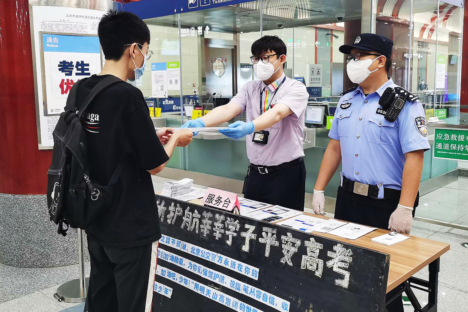 同时,公交警方通过开辟“绿色通道”、助考服务站等方式,努力做好对考生的服务工作。记者了解到,高考期间,公交警方会优先受理考生求助警情,保障考生顺利参加考试。同时,民警协调各地铁运营企业,在车站明显位置张贴考点引导标识,开辟进出站和安检绿色通道,方便考生快速通行;设置助考服务站为考生提供口罩、湿巾、饮用水、考试文具、急救药品等;布设主题展板、桌面摆件等陈设,为考生助力加油。