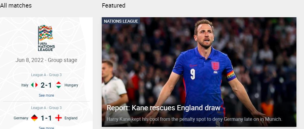 欧足联官网对本场比赛的报道,凯恩成为焦点人物。