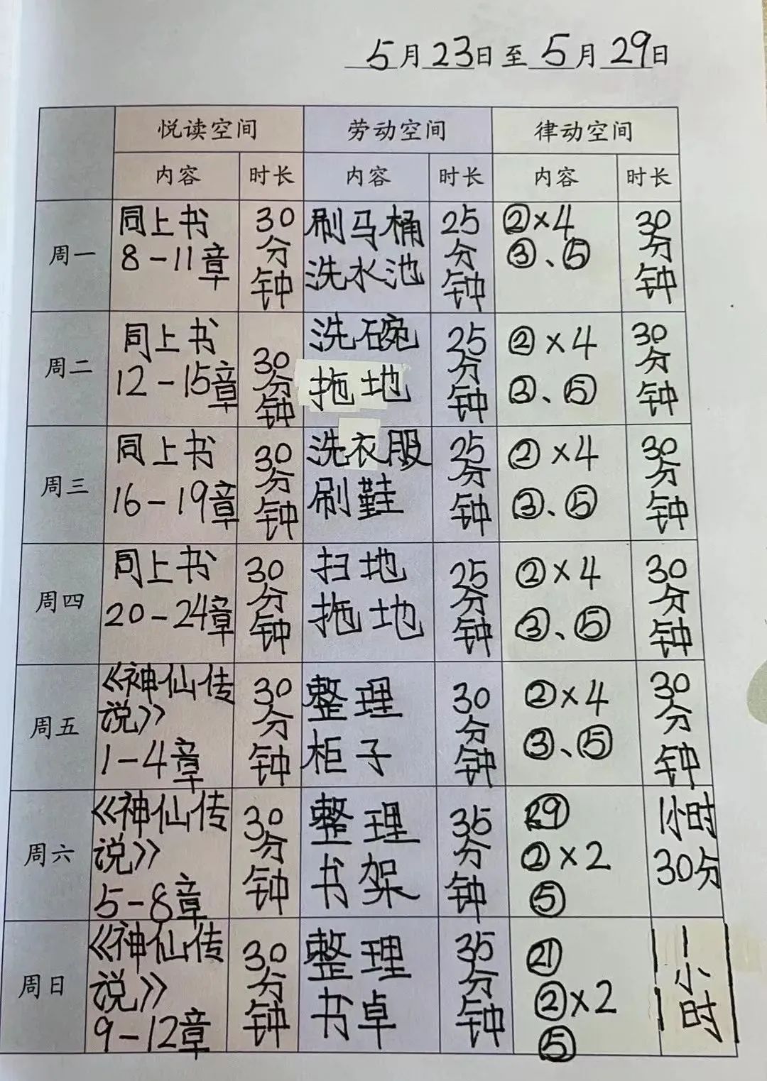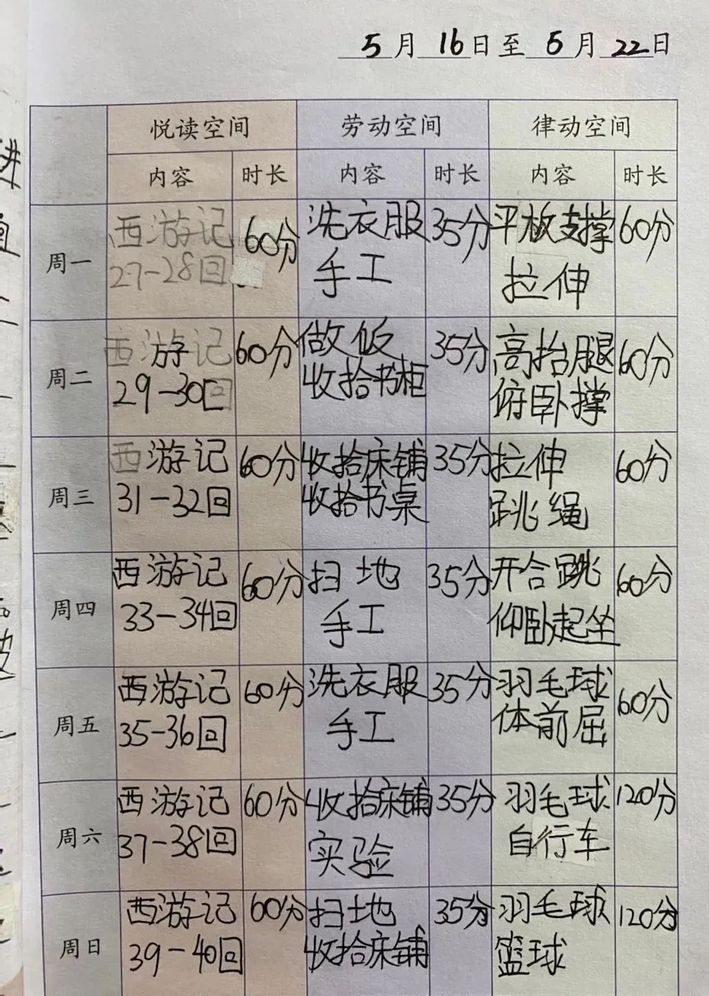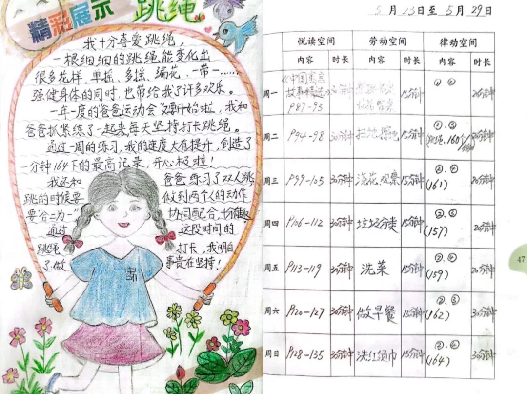第二阶段的体育锻炼——律动空间需要学生线下自主完成。体育教师为学生线下体育锻炼提供丰富的内容选择。老师们针对各年级实际情况,在《健康成长手账》中已有的32个自主练习项目基础上,为学生们增加了80余项趣味游戏、亲子合作类的体育锻炼指导。