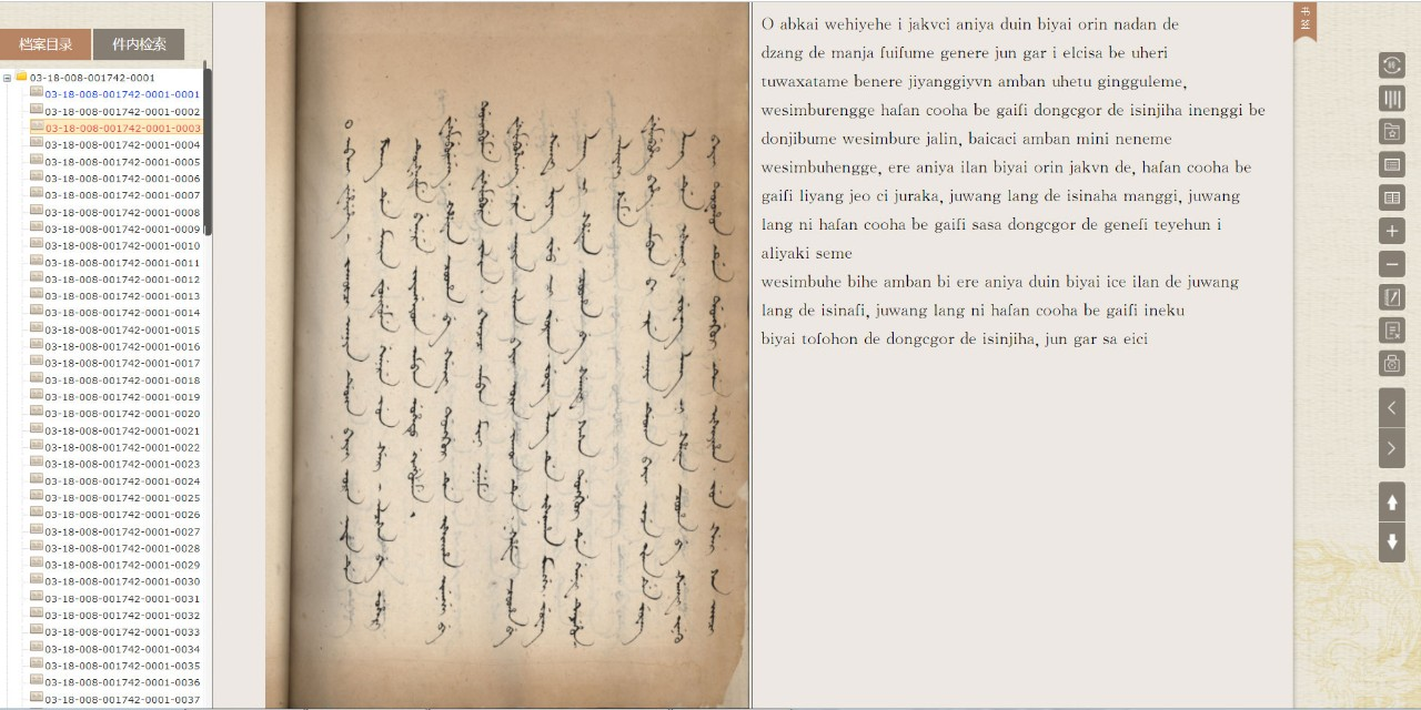 军机处满文专档——熬茶档全文检索数据库是推进满文档案信息化工作的新成果,是军机处满文专档全文检索数据库的组成部分,包含4册满文档案,1490画幅,近15万个满文单词,并且整合了满文熬茶档的著录信息。该数据库的对外开放,为利用者的档案查询提供了便利,同时也对乾隆初期准噶尔历史乃至西南和西北地区民族、边疆、政治、经济、文化、宗教等方面的研究具有十分重要的意义和作用。