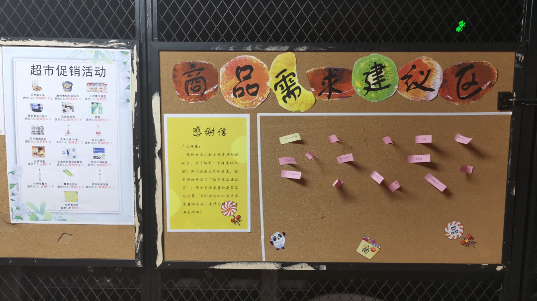 为了及时满足大家的需求,超市每天推出一款新鲜打折果蔬,并且设立了“商品需求建议区”,按照大家的需求及时补充商品。许多师生在这里写下了感谢的反馈和需求商品。