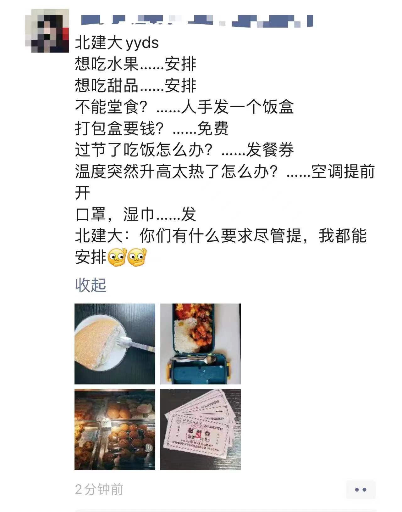 “北建大yyds,想吃水果甜品?安排!不能堂食?人手发一个餐盒!打包盒要钱?免费!过节了吃饭怎么办?发餐券!温度突然升高怎么办?开空调!口罩湿巾哪里买?学校发!北建大:你们有什么要求尽管提,我都能安排!”学生在朋友圈的开心表白,表现对学校各项措施非常满意。