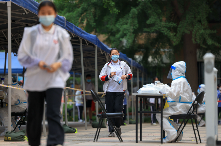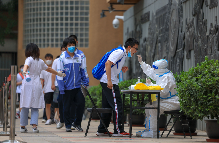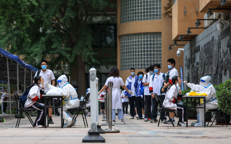 6月8日下午,记者在陈经纶中学考点看到,外语考试结束后,考生走出考场,在考点内有序排队做核酸检测。根据北京市2022年高考考生疫情防控要求,6月8日下午考试结束后,考生须参加考点统一组织的核酸检测。