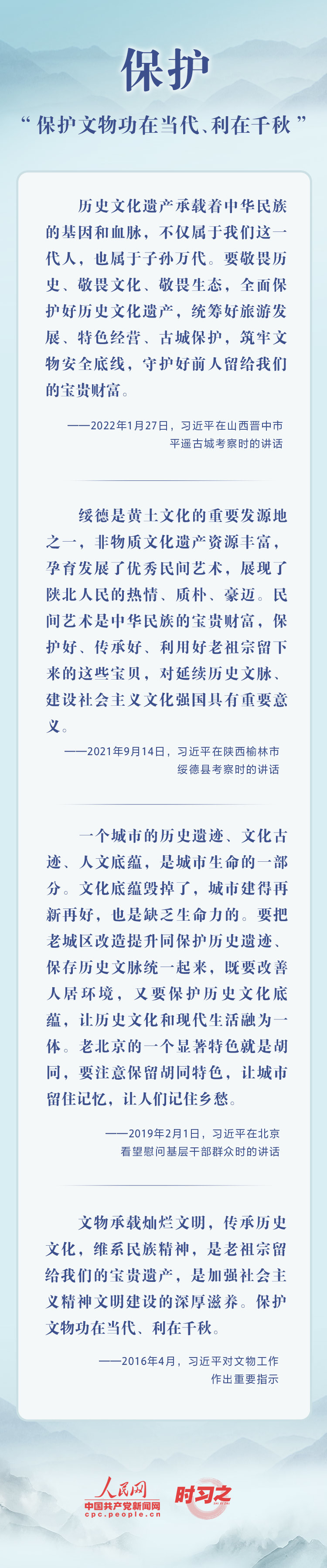 保护文物功在当代、利在千秋。今年6月11日是文化和自然遗产日,历史文化遗产承载着中华民族的基因和血脉,宝贵遗产的保护与传承,在习近平总书记心中重若千钧。习近平多次在地方考察时调研当地特色文化和历史古迹,并在不同场合反复强调文化和自然遗产保护工作的重要性。