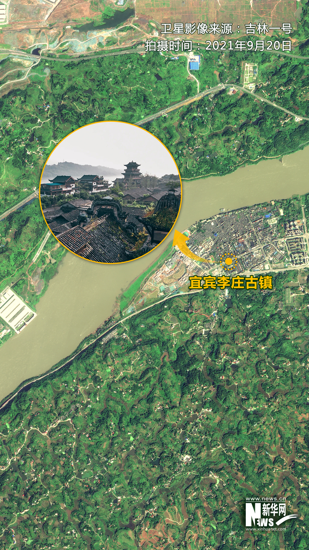 ▲卫星视角下的宜宾李庄古镇。卫星影像来源:吉林一号