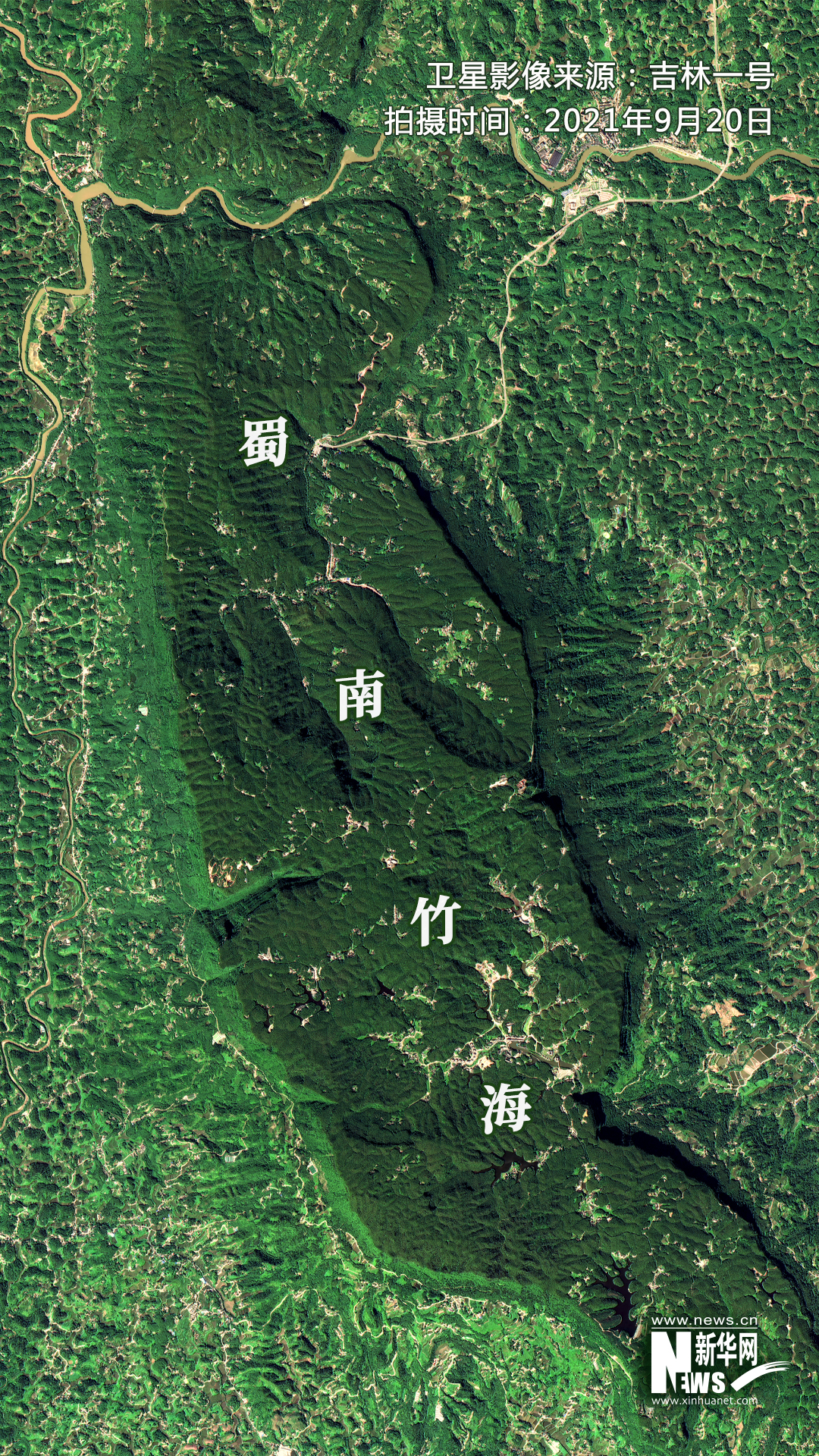 ▲卫星视角下的蜀南竹海。卫星影像来源:吉林一号