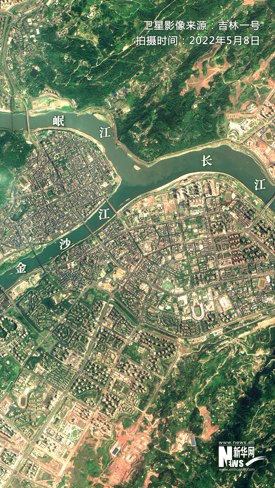 ▲卫星视角下的宜宾三江口。卫星影像来源:吉林一号