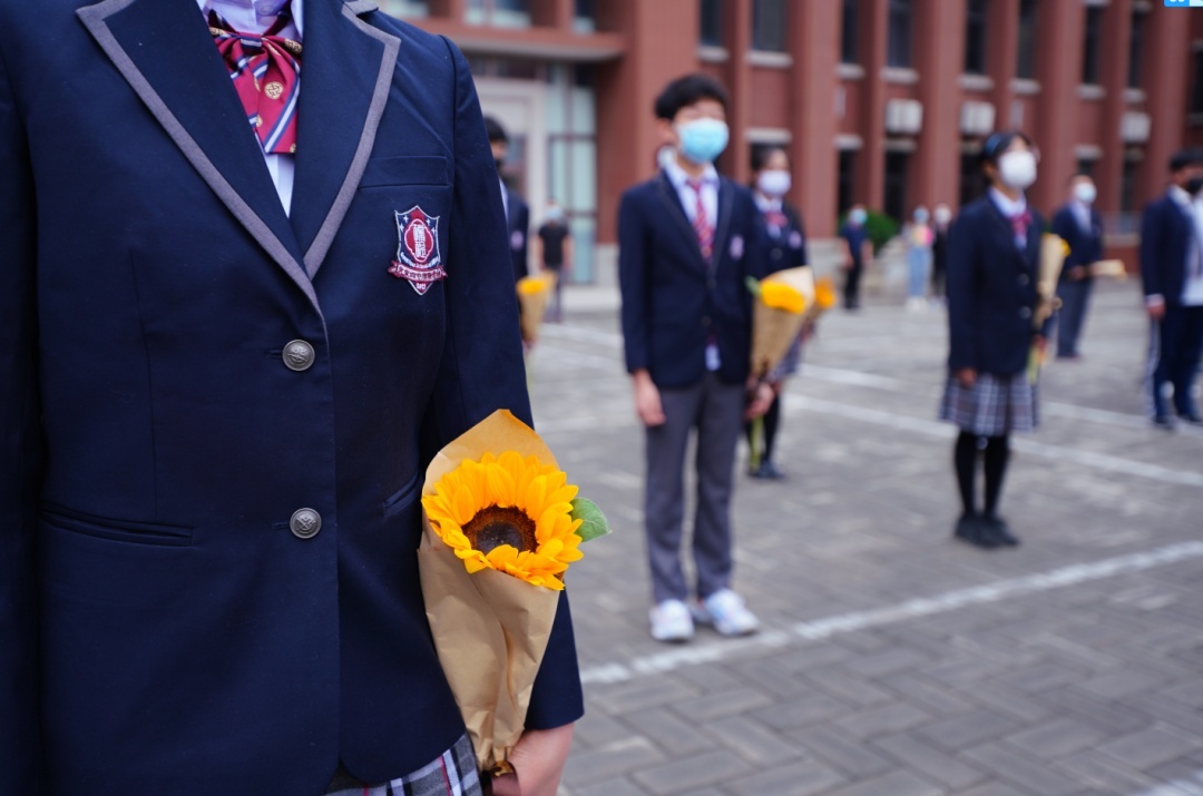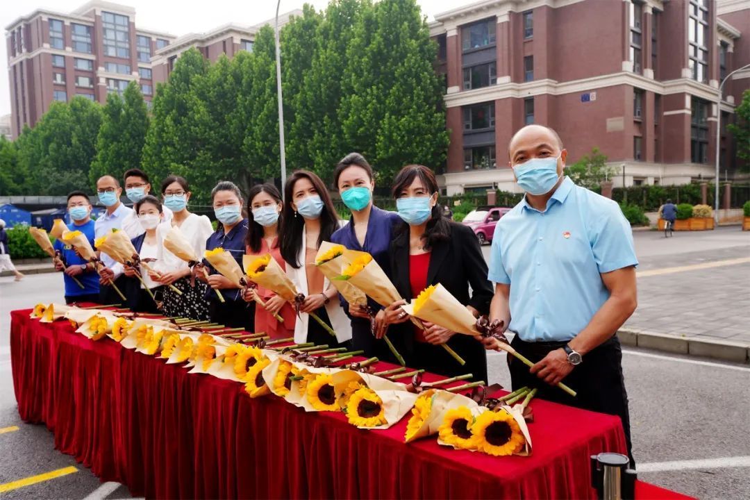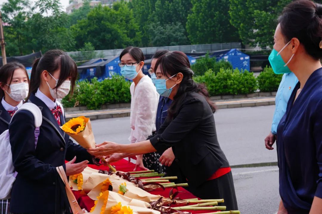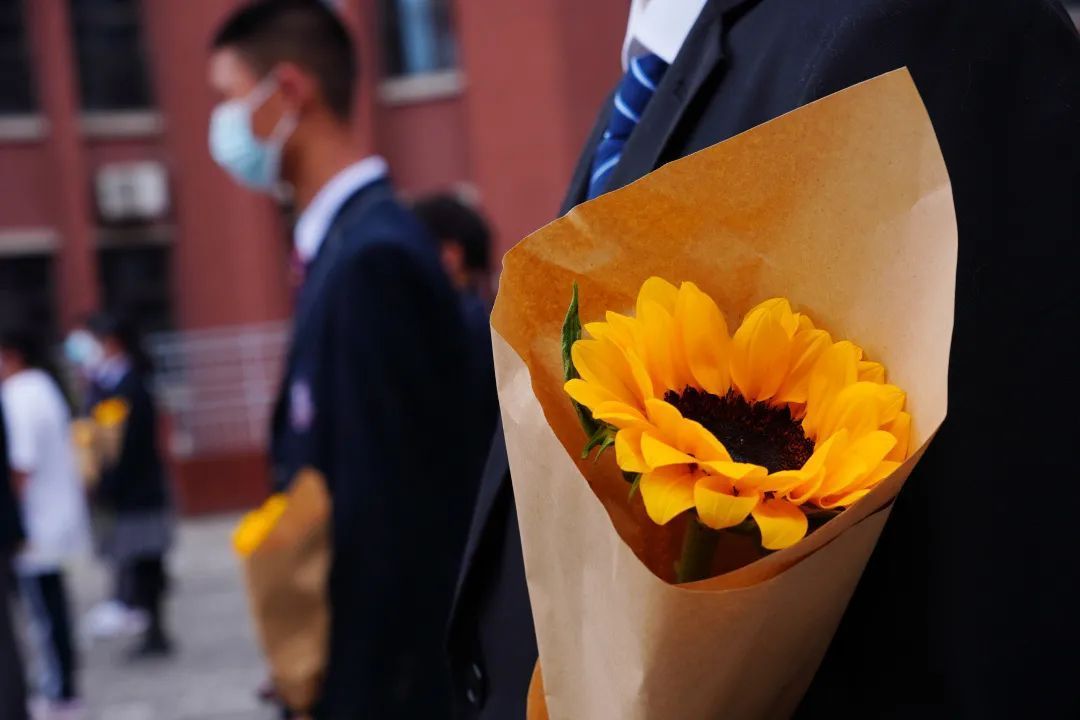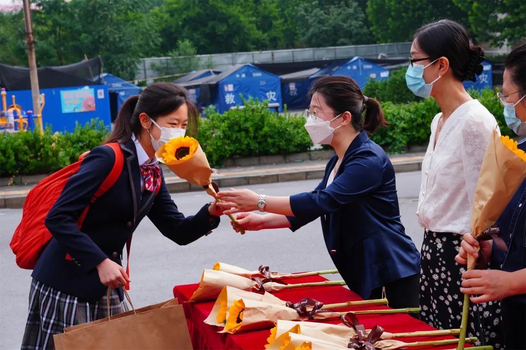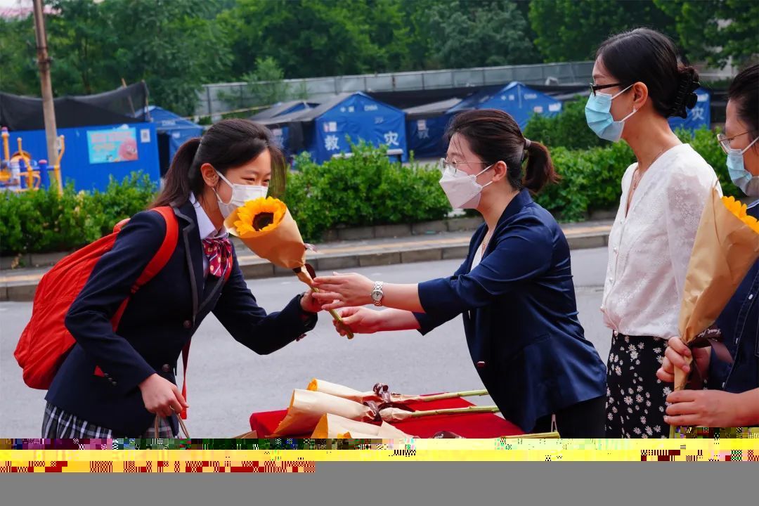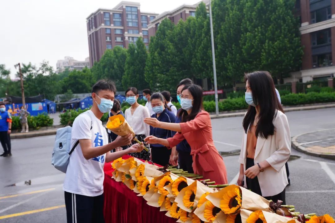 等待学生的是一场特殊的欢迎仪式,一份特别的返校惊喜:教师为学生一一送上向日葵花束。不仅表达着牵挂与想念,更寓意着教师希望学生向阳生长,在即将到来的中考当中一举夺“葵”。