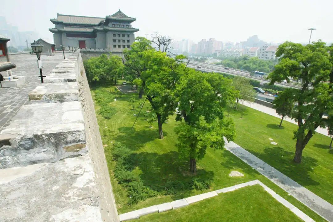 在崇文门和东南角楼之间,有一片广阔绿地,簇拥着北京现存最长的一段明城墙。绿地芳草萋萋,古树掩映;城墙斑驳,古韵犹存,古老的城墙与现代城市融为一体。