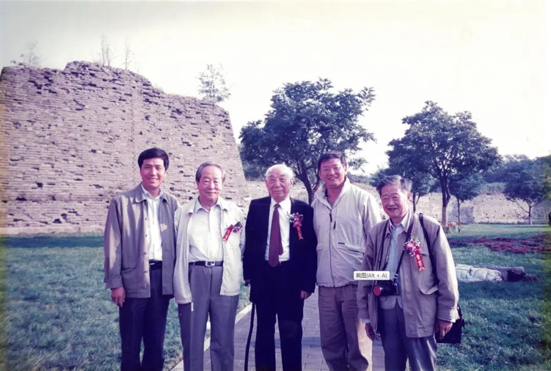 2002年国庆节前,北京明城墙遗址公园主体工程竣工时的合影,自左至右为:徐雄鹰、王世仁、郑孝燮、李彦成、罗哲文。 王玉伟摄