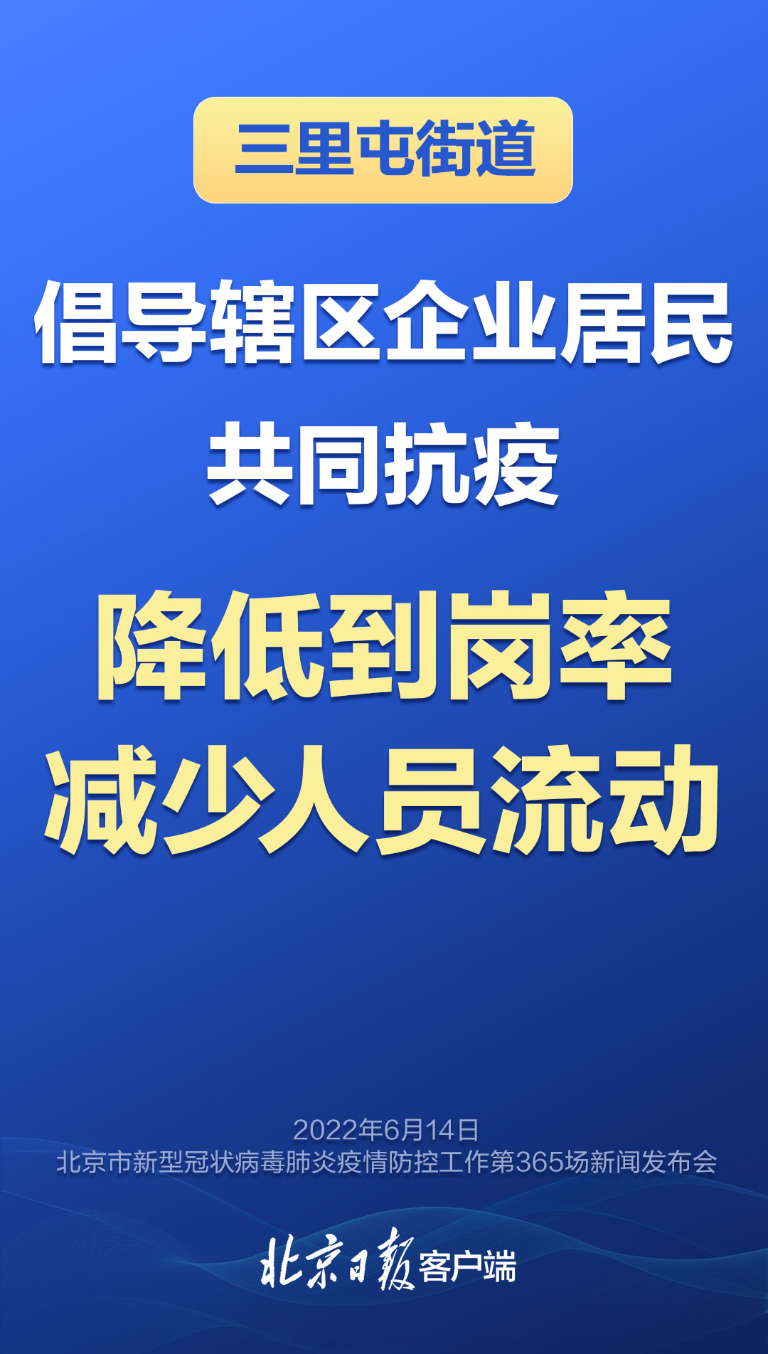 6月14日,在北京市新型冠状病毒肺炎疫情防控工作第365场新闻发布会上,朝阳区副区长孟锐介绍,三里屯街道倡导辖区企业、居民共同抗疫,降低到岗率,减少人员流动,让区域适度“静下来”,尽快阻断病毒传播链条。