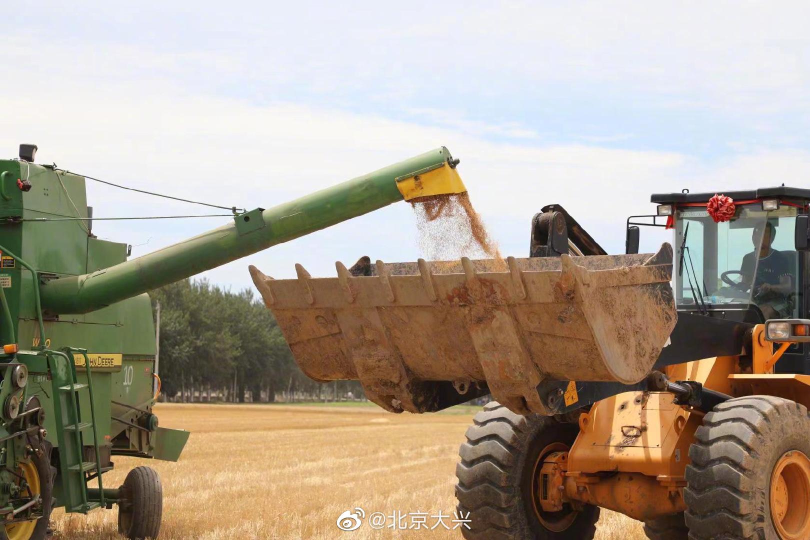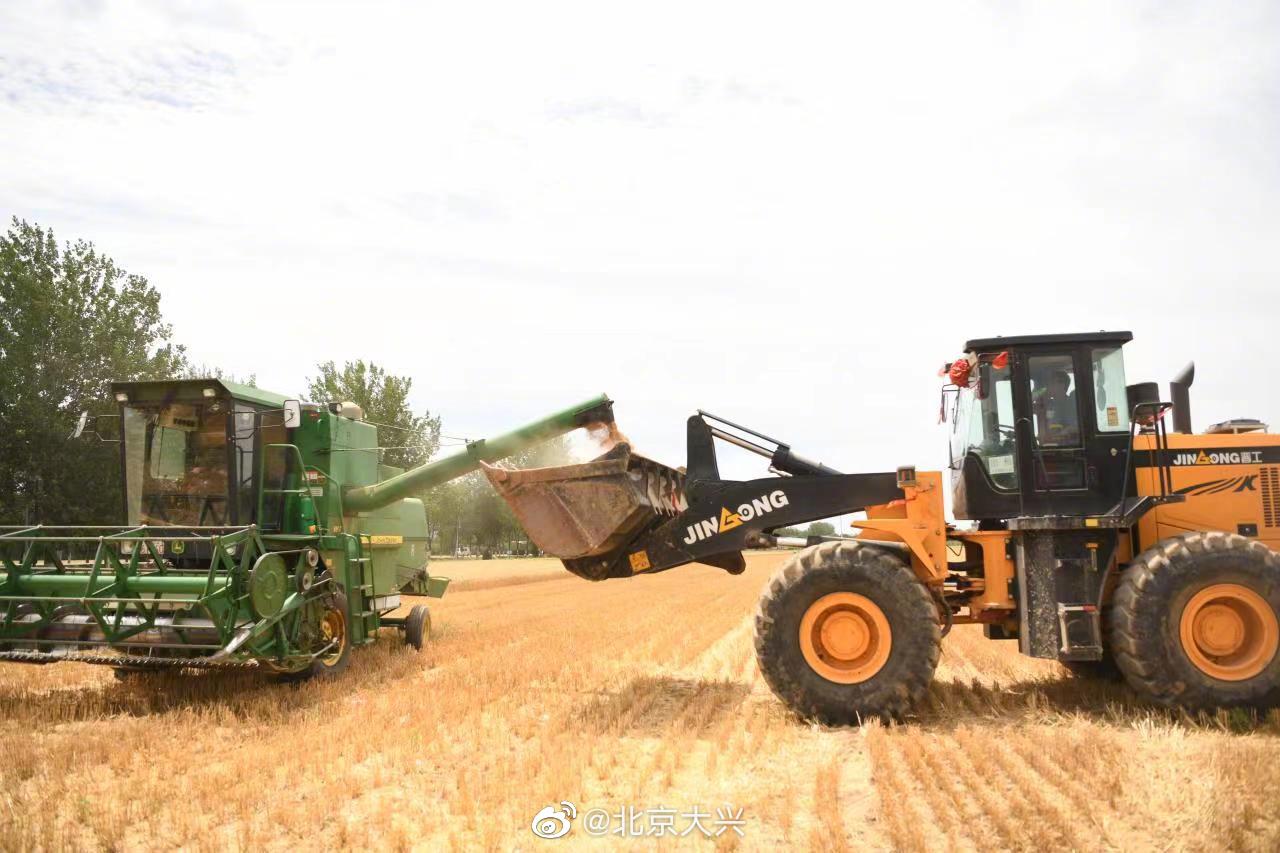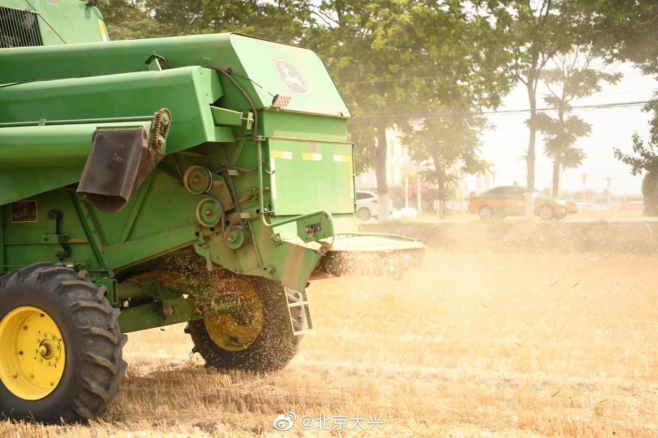 广阔的田野上麦浪翻滚、机械轰鸣,收割机正在有序作业,麦粒从收割机中“喷涌”而出,礼贤镇“流金”大地上一派丰收的景象。