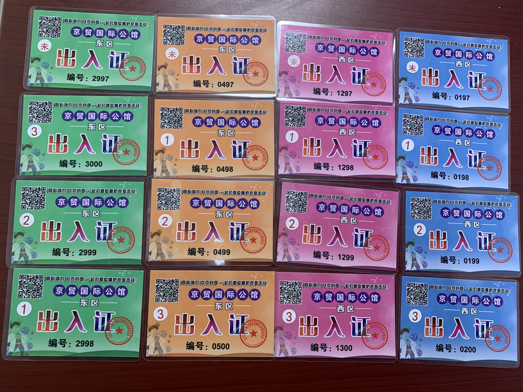 近日,京贸国际公馆的居民都领到了“独一无二”的专属小区出入证。根据所住的区域,出入证不仅分为红、黄、蓝、绿四种颜色,还标注了每个人的疫苗接种情况,确保每人一证,方便居民进出小区和值守人员查验。