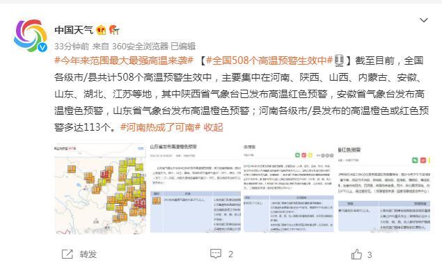 截至目前,全国各级市/县共计508个高温预警生效中,主要集中在河南、陕西、山西、内蒙古、安徽、山东、湖北、江苏等地,其中陕西省气象台已发布高温红色预警,安徽省气象台发布高温橙色预警,山东省气象台发布高温橙色预警;河南各级市/县发布的高温橙色或红色预警多达113个。
