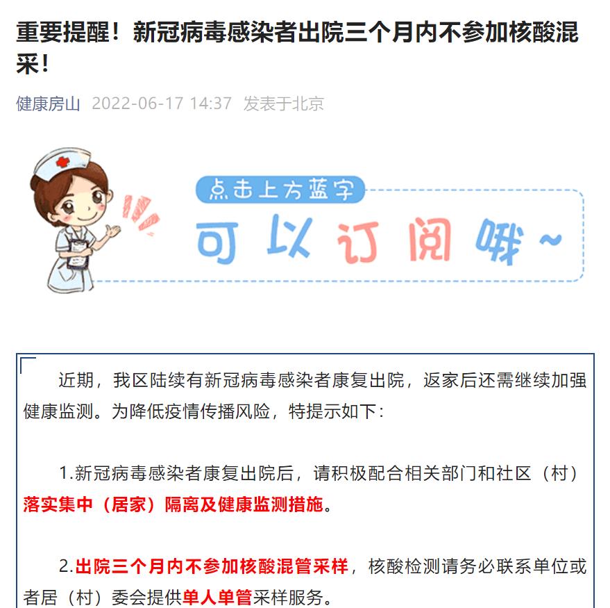 2.出院三个月内不参加核酸混管采样,核酸检测请务必联系单位或者居(村)委会提供单人单管采样服务。