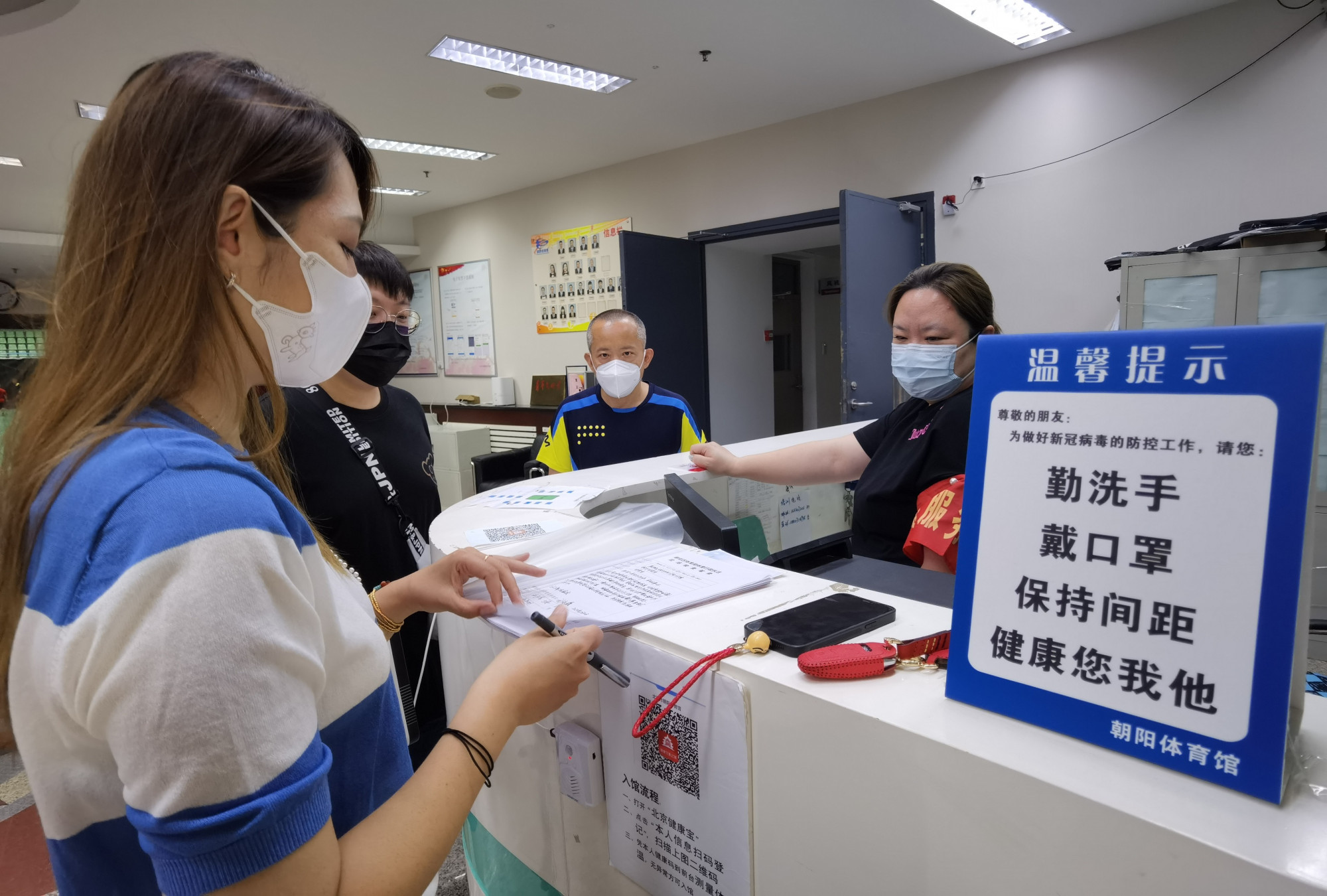 “咱们的防疫督导员是固定的吗?一共几人?”“一定要戴好袖章,把好关。”检查中,区体育局市场科工作人员刘佳还就体育健身场所设置防疫督导员情况进行了督导。“根据市体育局要求,各体育健身场所须在场所出入口处设置防疫检查岗和防疫督导员。”刘佳告诉记者,督导员上岗时必须佩戴明显标识并进行全程值守,严格执行所有进场人员测温、扫码登记、逐人查验72小时核酸阴性证明等防疫要求,严格落实“逢进必扫、逢扫必查”的要求,把好体育健身场所“入口关”。