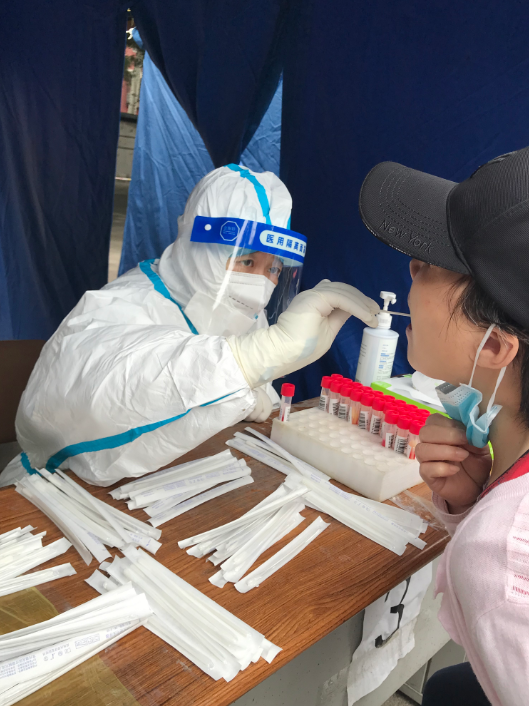 连续几日核酸下来,皮方方感觉面临的考验并不只是业务,更多的是意志。夏日炎炎,白色的防护服材质虽轻但密不透气,上下连体,袖口和裤腿都是收紧的,全副武装后只有两只眼睛露在外边,不用几分钟全身便汗如雨下。如今,皮方方深有体会,“只有真正成为‘大白’,才明白他们多么不容易”。