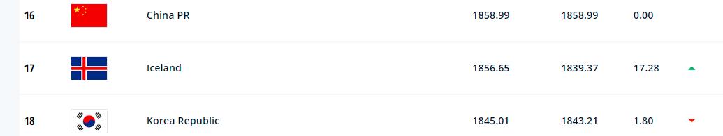 由于近期没有参加国际比赛,因此中国女足的排名积分较上一期(今年3月)没有变化,仍然为1858.99分。这一积分仍然排名在第16位。美国女足、瑞典女足、法国女足、荷兰女足、德国女足、加拿大女足、西班牙女足、英格兰女足、巴西女足和朝鲜女足排名前十位。在亚足联球队中,中国女足排名第4位,落后于朝鲜女足、澳大利亚女足(第12位)和日本女足(第13位)。