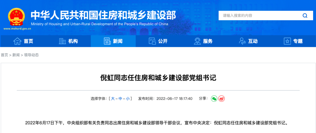 据住建部网站消息,2022年6月17日下午,中央组织部有关负责同志出席住房和城乡建设部领导干部会议,宣布中央决定:倪虹同志任住房和城乡建设部党组书记。