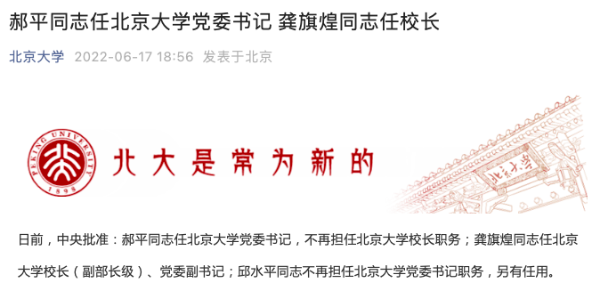 郝平同志任北京大学党委书记 龚旗煌同志任校长