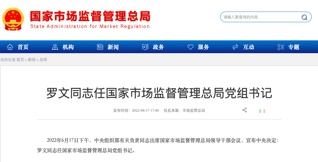 据国家市场监督管理总局网站消息,2022年6月17日下午,中央组织部有关负责同志出席国家市场监督管理总局领导干部会议,宣布中央决定:罗文同志任国家市场监督管理总局党组书记。