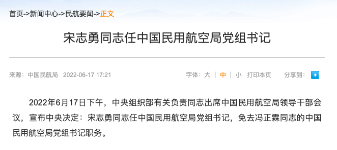 据中国民航局官网消息,2022年6月17日下午,中央组织部有关负责同志出席中国民用航空局领导干部会议,宣布中央决定:宋志勇同志任中国民用航空局党组书记,免去冯正霖同志的中国民用航空局党组书记职务。