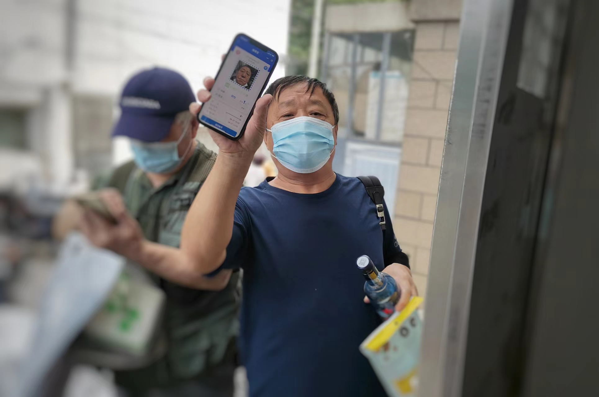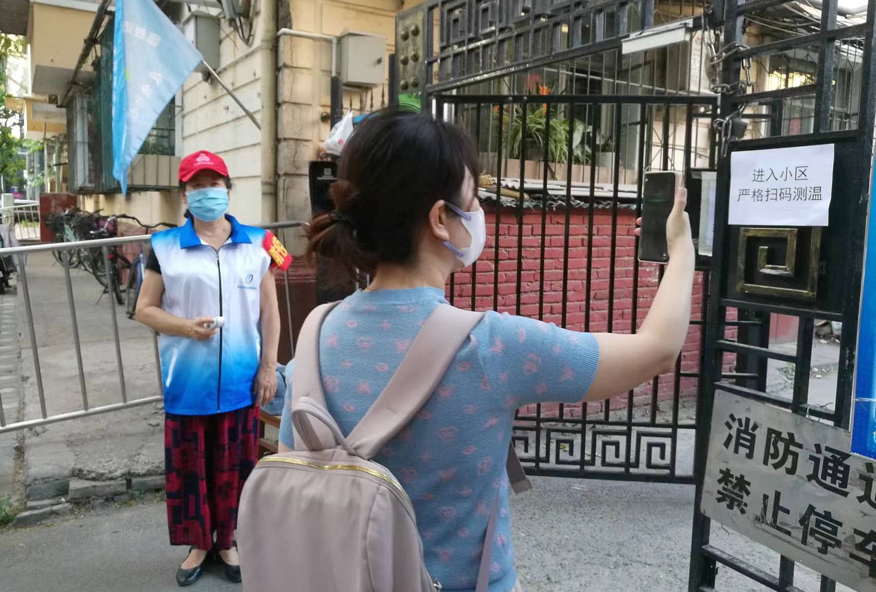 6月18日,在德胜街道德胜里二区一号院,居民主动扫“健康码”,接受体温测量后,进入小区。主动扫码测温正成为一种文明自觉。