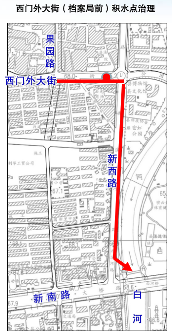 3. 西门外大街(档案局前)保留现状d1000~d1500mm雨水管道并新建□2800×2000~□4200×2000雨水管道。