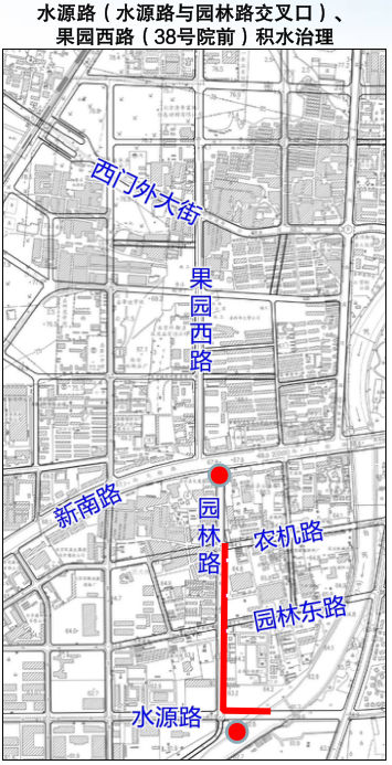 4. 果园西路(38号院前)、水源路(园林路南口)废除原有□2000×2000雨水管道并新建2□2000×2000~2□3600×2000雨水管道。
