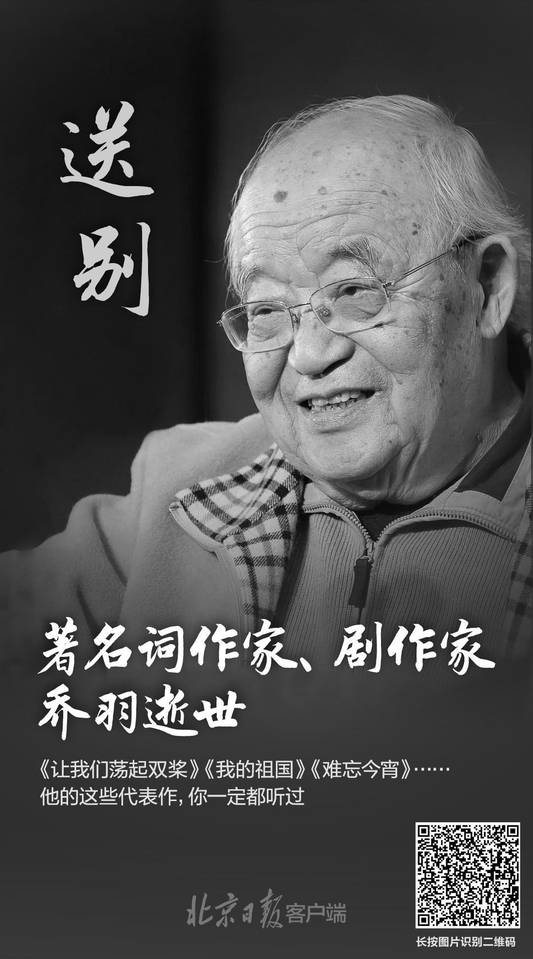 据著名词作家、剧作家乔羽之子乔方确认,6月20日,乔羽在京逝世,享年95岁,其代表作《让我们荡起双桨》《我的祖国》《人说山西好风光》《刘三姐》《难忘今宵》等传唱多年。