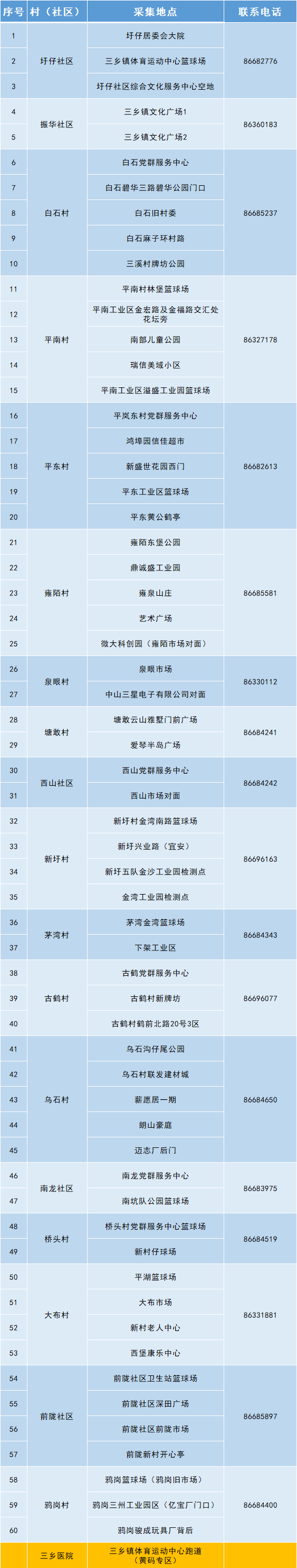 (四)开展区域核酸检测期间,三乡镇新冠病毒疫苗接种点暂停接种,11个社区卫生服务站暂停开诊,具体接种和开诊时间待通知,不便之处,敬请原谅。