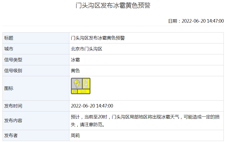 门头沟区发布冰雹黄色预警:预计,当前至20时,门头沟区局部地区将出现冰雹天气,可能造成一定的损失,请注意防范。