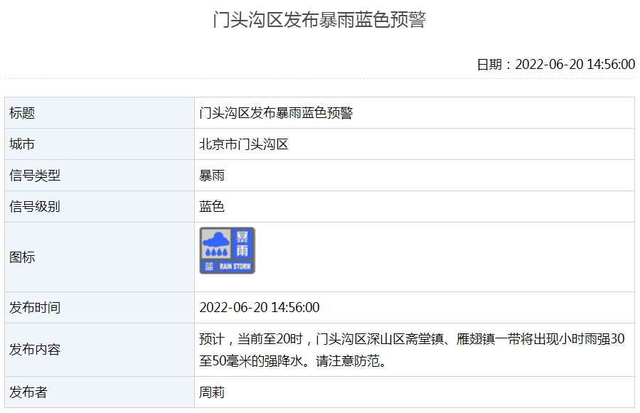 门头沟区发布暴雨蓝色预警:预计,当前至20时,门头沟区深山区斋堂镇、雁翅镇一带将出现小时雨强30至50毫米的强降水。请注意防范。