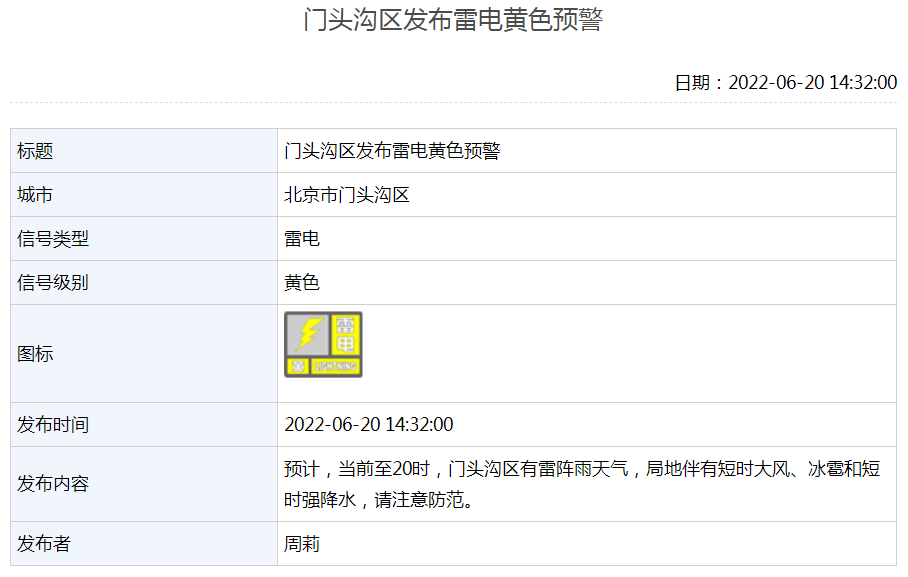 此前,13:50,门头沟区发布了雷电蓝色预警。