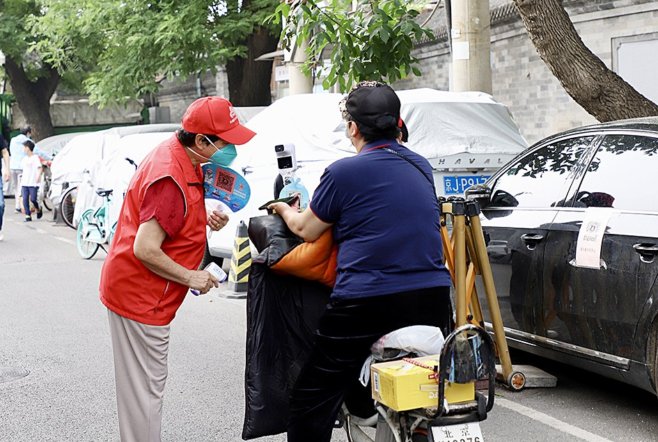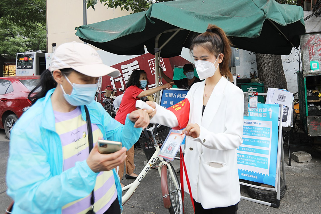 “请您扫码测温!”在塔院胡同4号院,平安志愿者张兰英正在岗位上忙碌着。与别的卡口不同,塔院胡同4号院属于平房区,在这里居住着四五十户居民。“这里还有一个情况比较特殊,院儿里有一处公厕,附近平房区的居民很多都要到院里来,所以我们的值守必须更加严格。”与张兰英一起在点位上值守的是志愿者任亚南,她家住在与塔院胡同4号院一街之隔的荷包胡同。