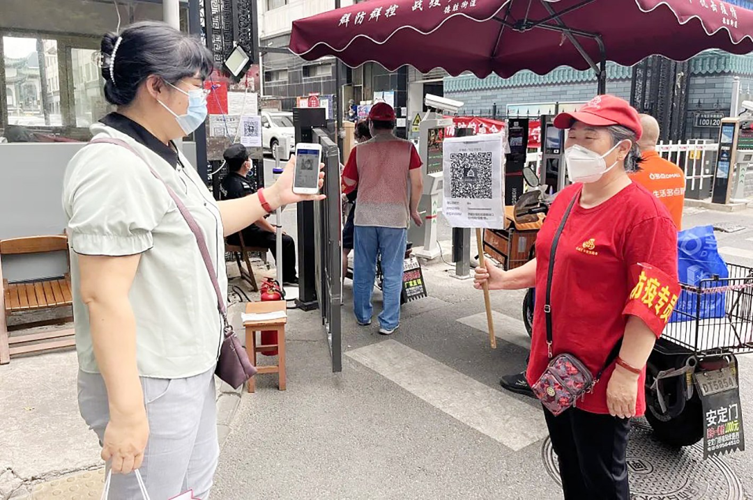 “您好,请扫码登记,看一下您的72小时内核酸阴性证明……”下午6点,在永宁胡同东口,保安老刘(化名)正在对行人和车辆进行认真询问和查验。“这个时间还可以,凌晨才是24小时值守最难的点,需要抵抗睡意和暑热,所以我就来回走动,这样不仅可以查看有没有异常情况,还可以提神。”老刘说:“现在晚上除了测体温等‘四件套’,更多的是提醒大家注意个人防护,佩戴好口罩。”