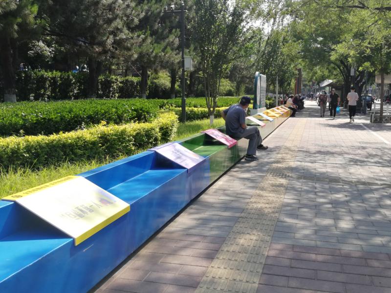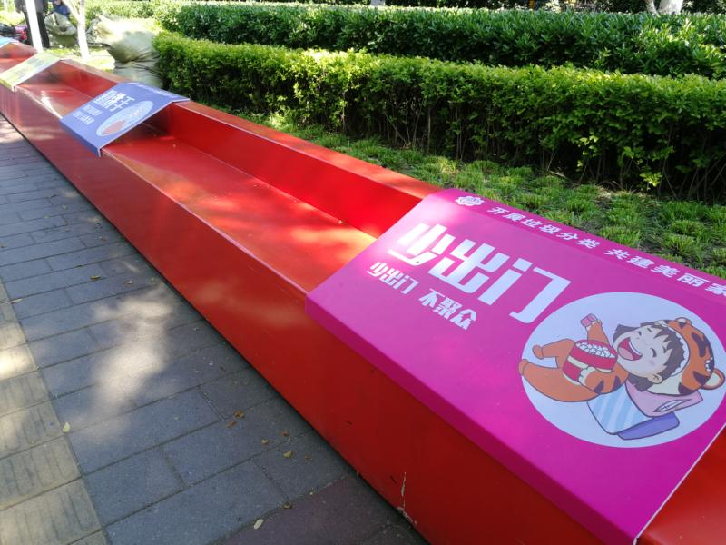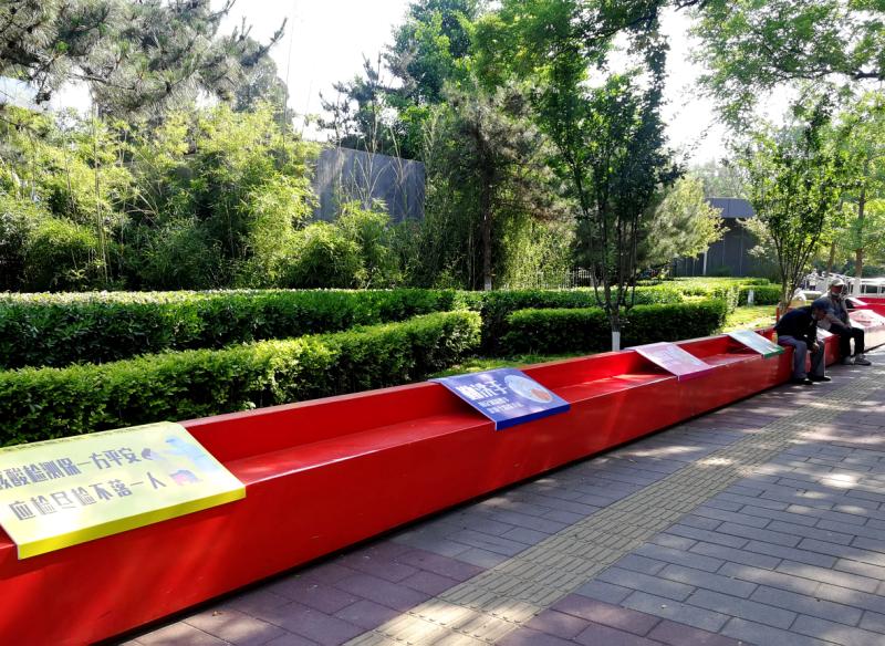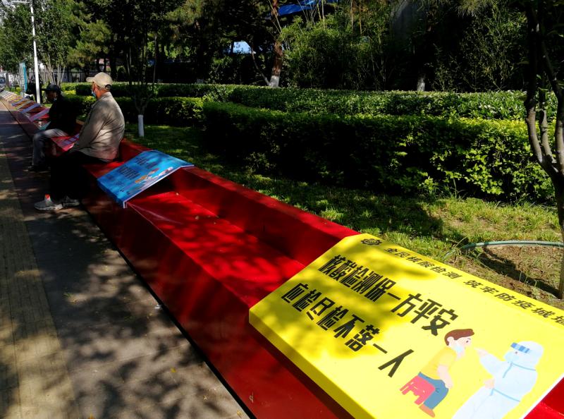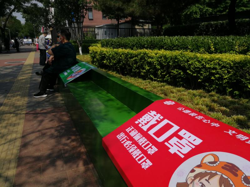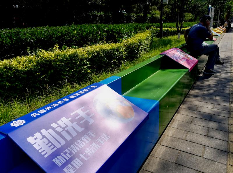 6月20日,市民坐在装有疫情防控卡通提示牌的长椅上休息。为有效减少人员扎堆、聚集聊天情况,石景山区八角街道古城南路社区对古城公园南侧总计80余米长的休闲座椅,按照2米间距安装了27块疫情防控卡通提示牌,提醒市民拉开距离,有效改善在休闲过程中不经意间所发生的聚集现象。